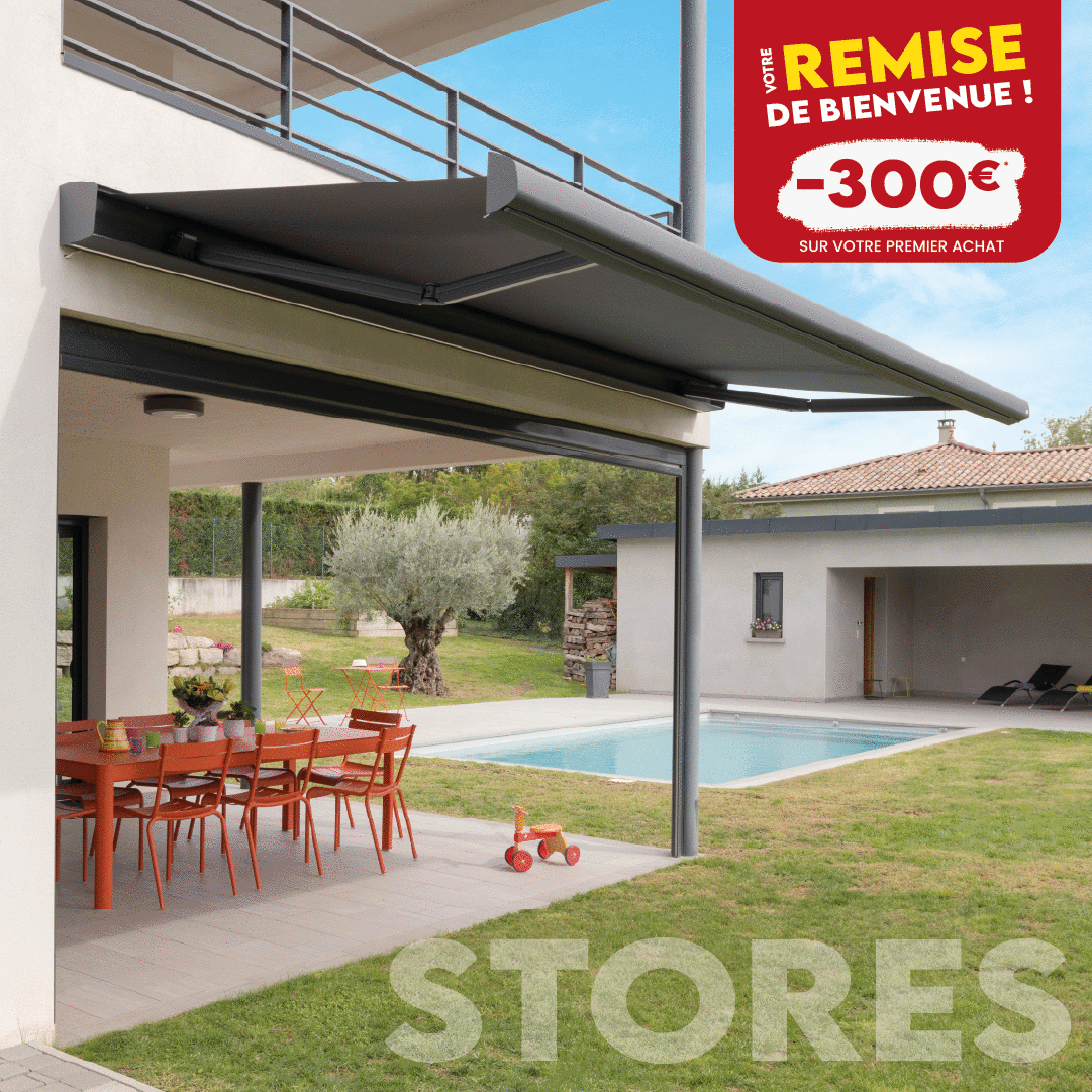 *Remise applicable sur nos stores, pergolas, carports, stores intérieurs, stores zipscreens, portes de garage, volets roulants, fenêtres, portes d’entrée, pour tout achat d’un montant minimum de 2500€. Remise appliquée sur le produit, hors pose et hors TVA, jusqu’au 31/12/2025, non cumulable avec d’autres offres en cours. Voir conditions en magasin.